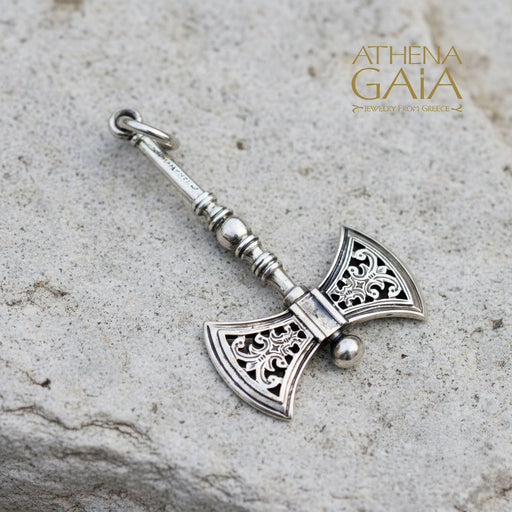 GerochristoCultural NoteThis pendant is inspired by the ancient Minoan double battle axe known as a labrys, which is what Zeus used to invoke a storm.