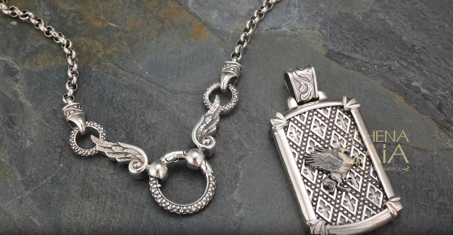 View full detailsSpecifics This is a 4mm rolo chain with an opening center loop anchored by two anthemions and circles. The center loop has a hinged opening that al...
