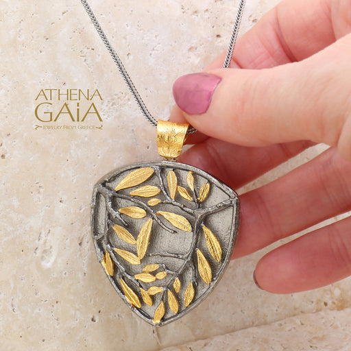 StilviCelebrateNature and the importance of the olive in Greek culture with the Softri Olive Tree Pendant. It's crafted from 925 Sterling Silver with Gol...
