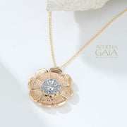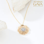 The Mythical Anemone Key Pendant Necklace is crafted in two-tone 18k Gold with 8 diamonds, set in an anemone flower shape and surrounded by a classic Greek Key design. This pendant offers a refined touch of sophistication to elevate any outfit, and the necklace will be custom made to your desired length.