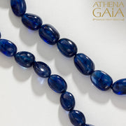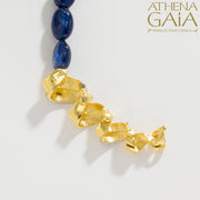 A single strand of blue sapphire beads strands creates a "river" of deep blue with a diamond encrusted 18k gold ribbon pendant. An additional golden ribbon holds the design at optional lengths for easy on and off, and moveable placements on the neck.