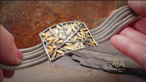 Celebrate Nature and the importance of the olive in Greek culture with the large Softri Olive Tree Bracelet. It's crafted from 925 Sterling Silver with Gold plating and features a bold, three-dimensional olive tree ornament (the tree appears to grow organically from the bracelet’s surface). It has a flexible lightweight band, with a secure hook clasp. This charming piece adds a lively, natural touch to both every day and formal attire.