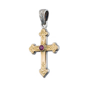 This Classic Orthodox Cross in Sterling Silver and 18k Yellow Gold with round center Ruby is simple and elegant, making it perfect for everyday wear.