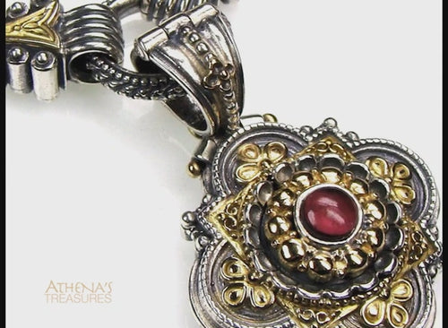 Meet your new favorite bracelet. This Santorini Empty Charm Stone Arrow Bracelet combines arrow shaped links— each set with a vibrant Ruby in 18k Gold— and Sterling Silver for a look that's both elegant and playful. The secure toggle closure keeps everything in place, while the open circular links are ready for your charms. Build it your way, one charm at a time, and watch it evolve into something uniquely yours. (Charms sold separately.)