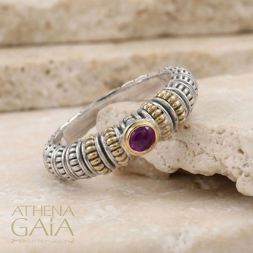 GerochristoThis simple yet classically elegant Kyma Stone Flower Bezel Band Ring is crafted from 925 Sterling Silver, with a center Ruby set in an 18k Gold be...