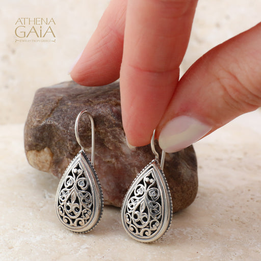 Crafted in sterling silver, these earrings embody a dialogue between tradition and innovation. Inspired by Greek artistry, their fluid lines and intricate details highlight the mastery of handwork passed down through generations. They are jewelry designed not only to complement your look, but to speak to your inner sense of identity and sophistication.
