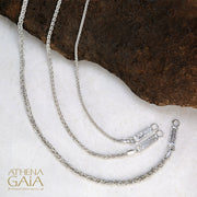 This 925 Sterling Silver Spiga (or Wheat) Chain is in Byzantine design and comes in various lengths and widths. It's a great chain for small and medium-sized Gerochristo pendants, and features a lobster clasp for easy on and off. An 18 inch 2.2mm width chain weighs approx 9 grams. A 1.8mm 18 inch chain weighs appox 6.5 grams.