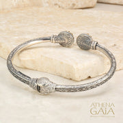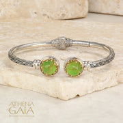 The Aegean Colors Hinge Bracelet brings the essence of the Aegean to your wrist, with a perfect harmony of 18k gold and Sterling Silver. An easy to wear and intricately detailed hinged bracelet, that will be custom crafted with your choice of Quartz Doublet.
