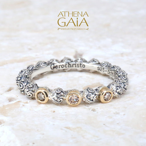 AG-GerochristoThis Meadow Breeze Triple Round Stone Stackable Ring features a 925 Sterling Silver high-detail band and 3 gemstones with 18k Gold bezels. This rin...