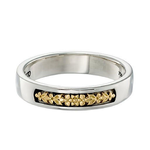 View full detailsThis Phyllon Band Ring features a detailed 18k Gold botanical pattern set in an elegant Sterling Silver band. A beautiful ring that can be worn alo...