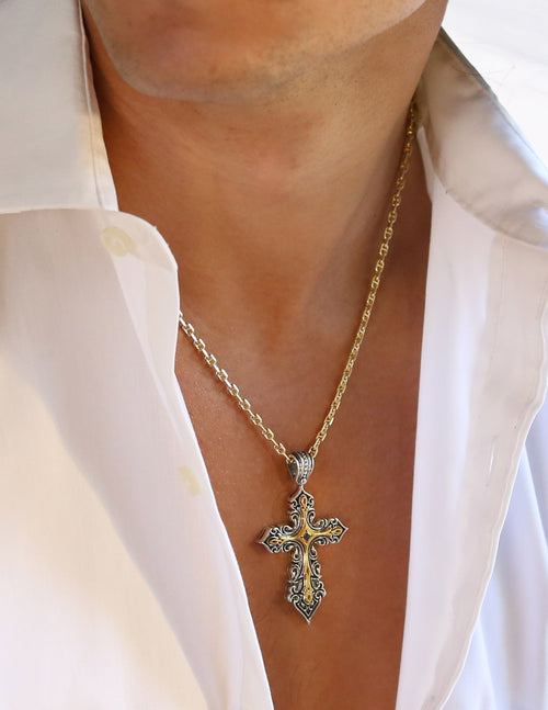 View full detailsThis highly detailed Chi Rho Latin Cross is crafted from 18k Gold and Sterling Silver, with a large opening bale that will accommodate most chain s...