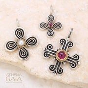 This Monastiraki Greek Cross is crafted from sterling silver and features a round stone set in 18k gold. The cross brings forth the enigma of ancient history found in the little church of Monastiraki and is perfect for baptisms or as a daily reminder of your beliefs.