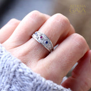 This listing is for a size 7.25 18k White Gold Byzantine Embroidery Graduated Band Ring, as shown. This classic and easy to wear ring features a center Ruby flanked by two Blue Sapphires, and is beautiful worn alone or stacked with another.