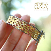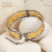 Inspired by nature, this Olive Grove Open Hinged Bracelet is the perfect way to celebrate the unparalleled beauty and importance of the olive in Greek culture. Crafted from 925 Sterling Silver with Gold plating, this bracelet features delicate leaves nestled inside a smooth, solid border. It effortlessly blends elegance with a playful twist and is perfect for brightening up any outfit, casual or formal. This bracelet has a hinged opening with a secure pin clasp, making it perfect for every day wear.
