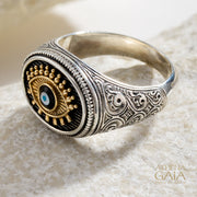 Crafted from solid 925 Sterling Silver and 18k Gold, this wide band Oval Evil Eye Signet Ring boldly serves as a powerful shield against negative energies. This unisex ring is designed with striking details on both the face and shank and features a tapered back for everyday comfort, making it ideal for all type of occasions and personal styles.