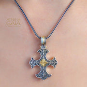 Patmos Gold Center Flared Cross - 18k Gold and Sterling Silver - Cross Necklace