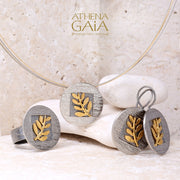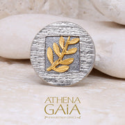 Celebrate nature’s charm with this Round Champion Olive Branch Ring. This ring features a solid 14k Gold olive branch set on a textured 925 Sterling Silver base. This ring beautifully captures the Greek tradition of honoring the importance of the olive.