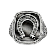 Crafted from solid 925 Sterling Silver, this Horseshoe Talisman Ring is a classic symbol of luck. This bold unisex ring is designed with striking details on both the face as well as the shank, and features a tapered back for everyday comfort— making it ideal for all type of occasions and personal styles.