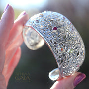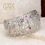 This Wild Flowers Cuff Bracelet is a beautiful statement piece, with a wide and high-detailed presence. Crafted from 925 Sterling Silver with mixed gemstones, this cuff is one size and fits the average 6-8 inch wrist.